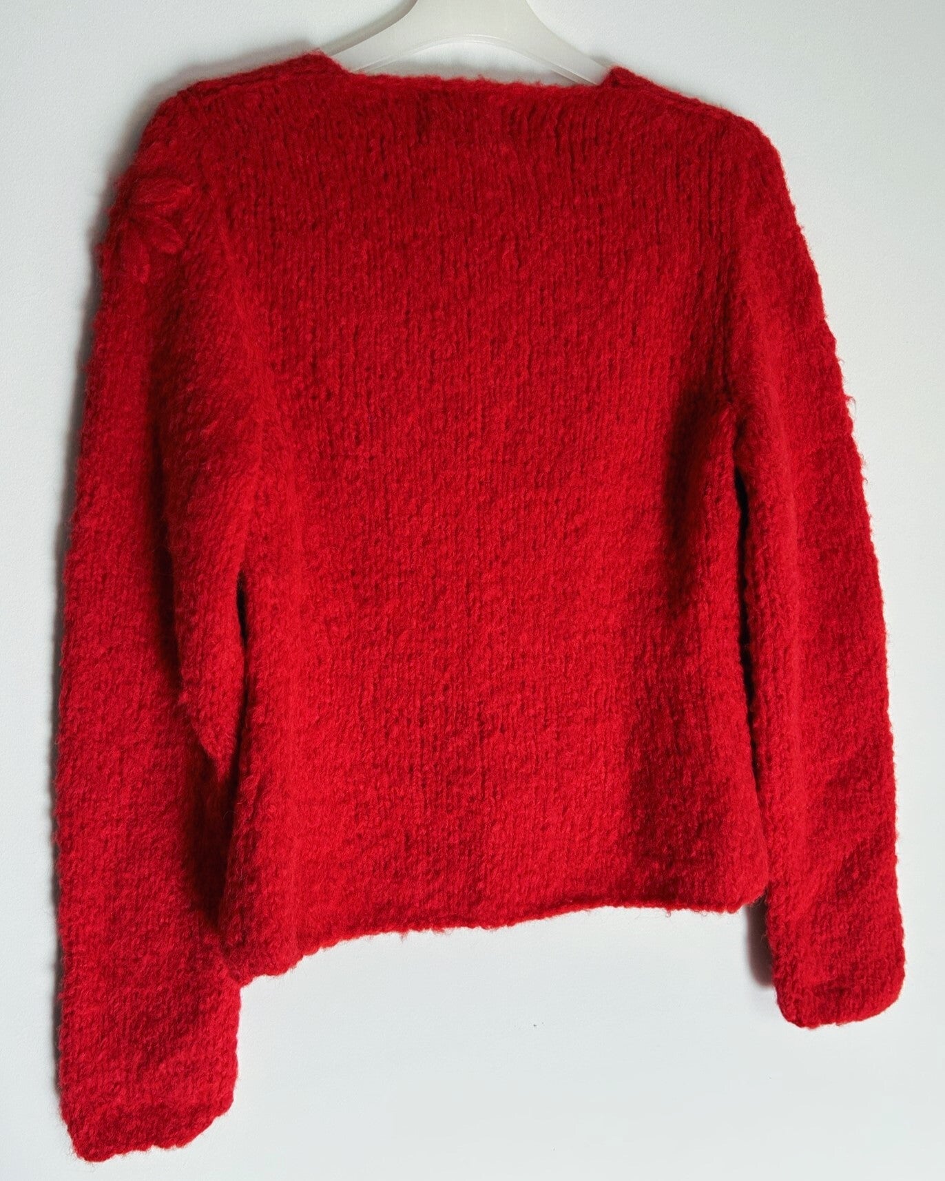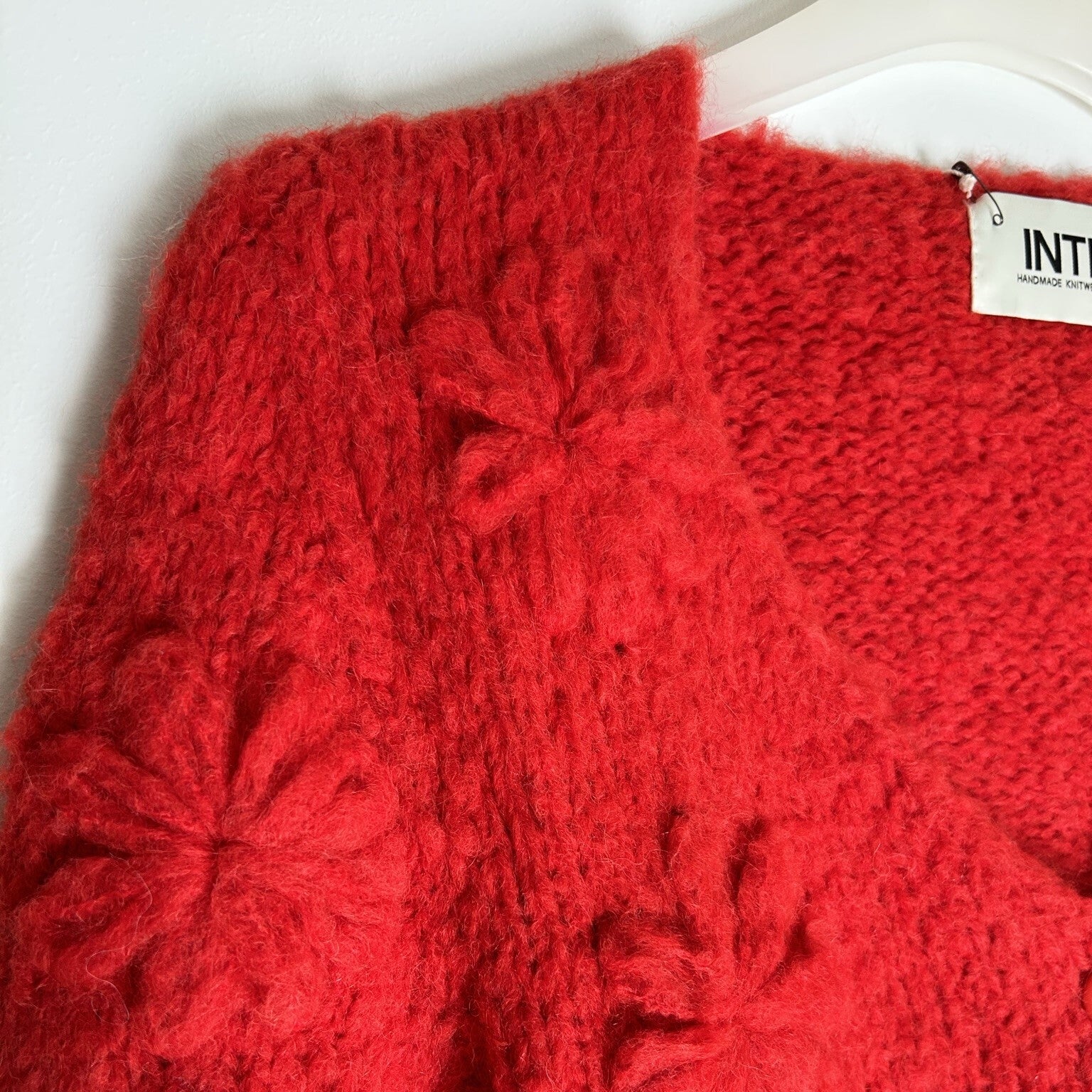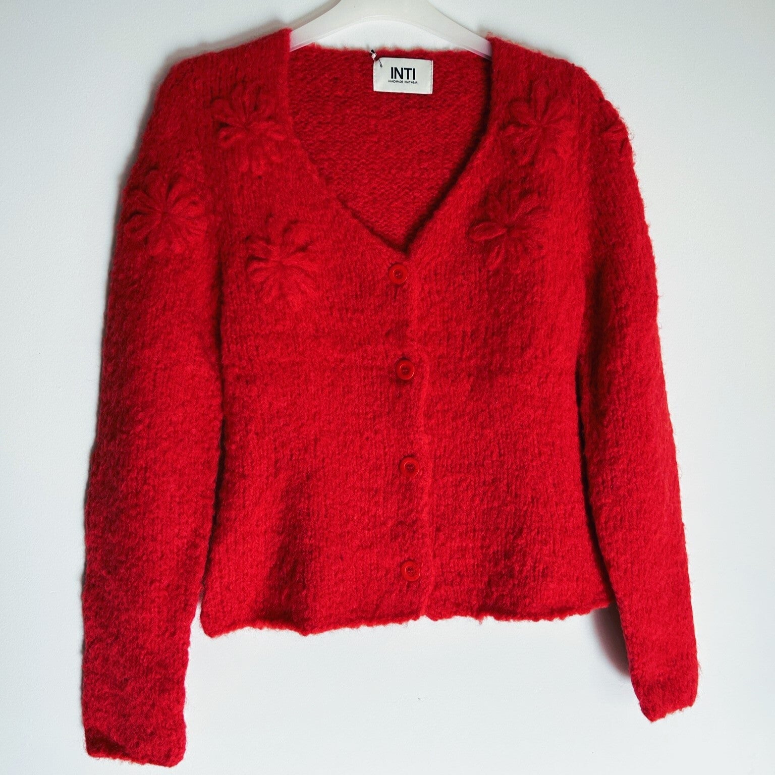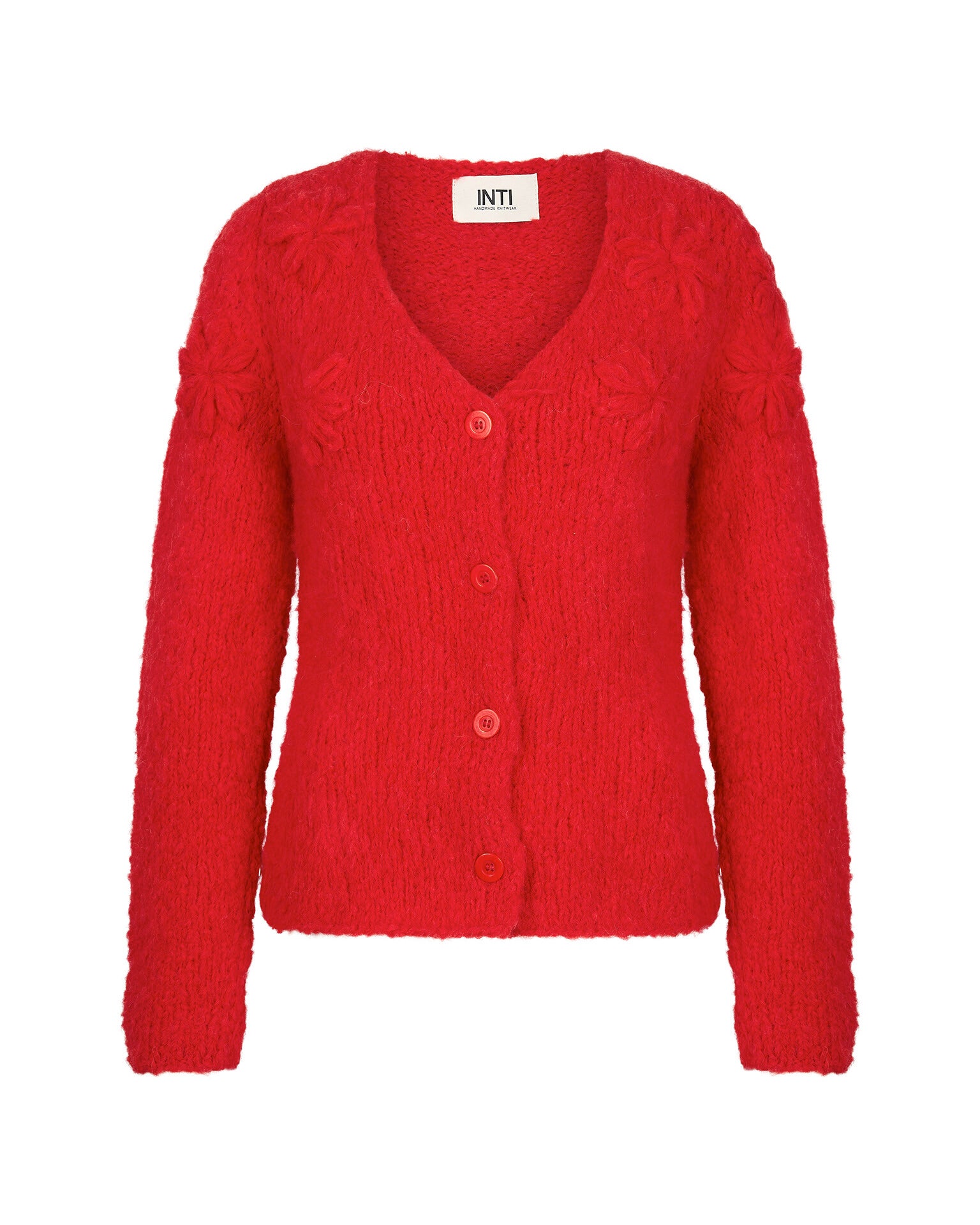 Dit getailleerde vest van INTI Knitwear heeft een V hals en elegante geborduurde bloemen. Het vest sluit met knopen aan de voorzijde en is een heerlijk vest all-year-round over een shirt of jurk. De kleur is een warme dieprood. Maat M heeft een lengte van 60cm (middenachter).