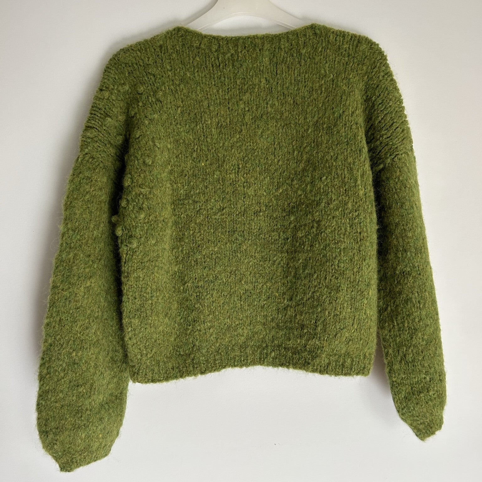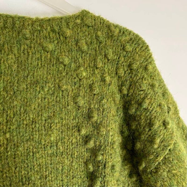 Deze trui van INTI Knitwear heeft een rechte hals en een bolletjes patroon op de linker schouder. De trui is gemaakt van een prachtige gemeleerde groen. Het model is wat breder en korter, mooi op een rok of high-rise broek. De lengte bij maat M (middenachter) is 52cm.