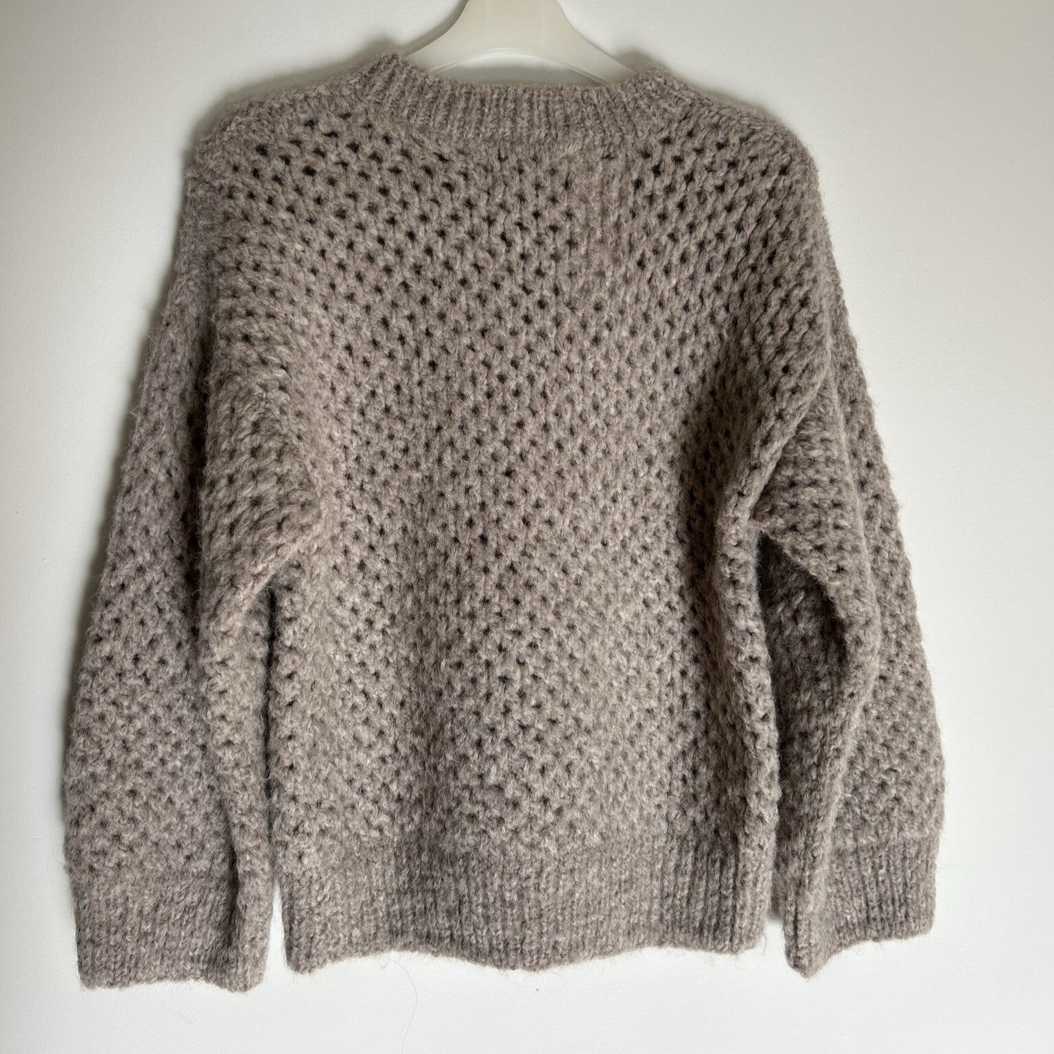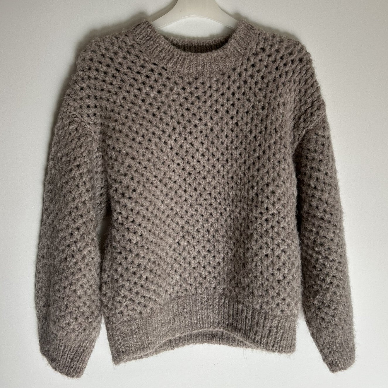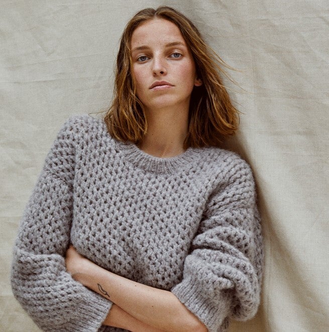 Deze prachtige opengewerkte trui van INTI Knitwear heeft een opstaand boordje en is ruimvallend. Lekker 'lazy' oftewel een casual look. De kleur laat zich het best omschrijven als warm grijs. Maat M-L heeft een lengte van 62cm (middenachter, incl. boord).