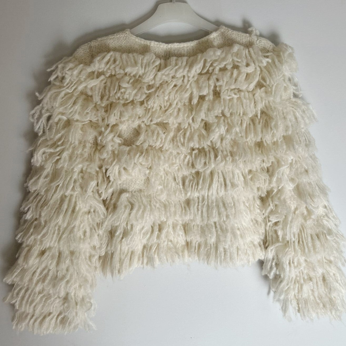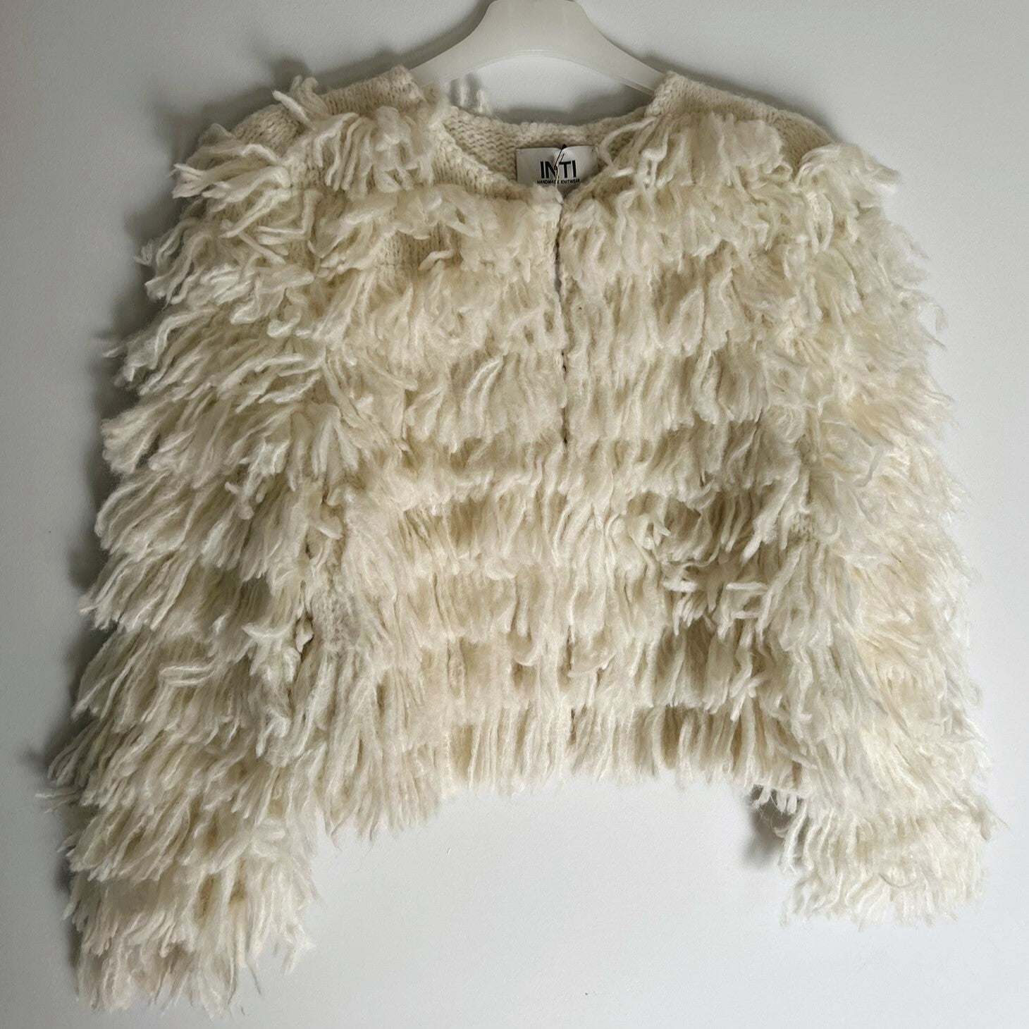 Dit feestelijke vest van INTI Knitwear is voorzien van flosjes. Het is gemaakt van natuurlijk ecru-kleurige alpaca wol. Het model is wat korter; ideaal over een jurk, rok of high-waist broek. Het vest wordt gesloten met 4 kleine haakjes. De lengte bij maat M (middenachter) is 48cm.