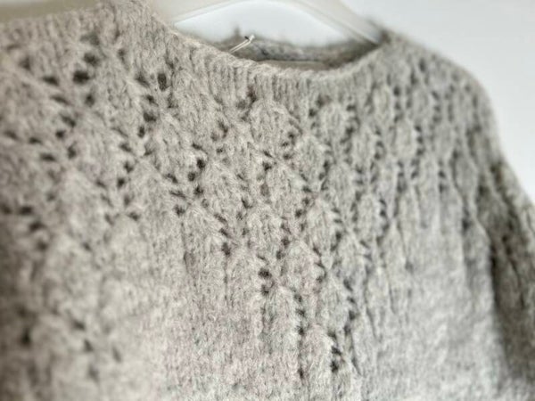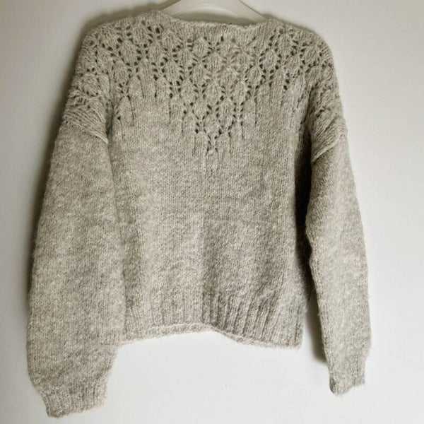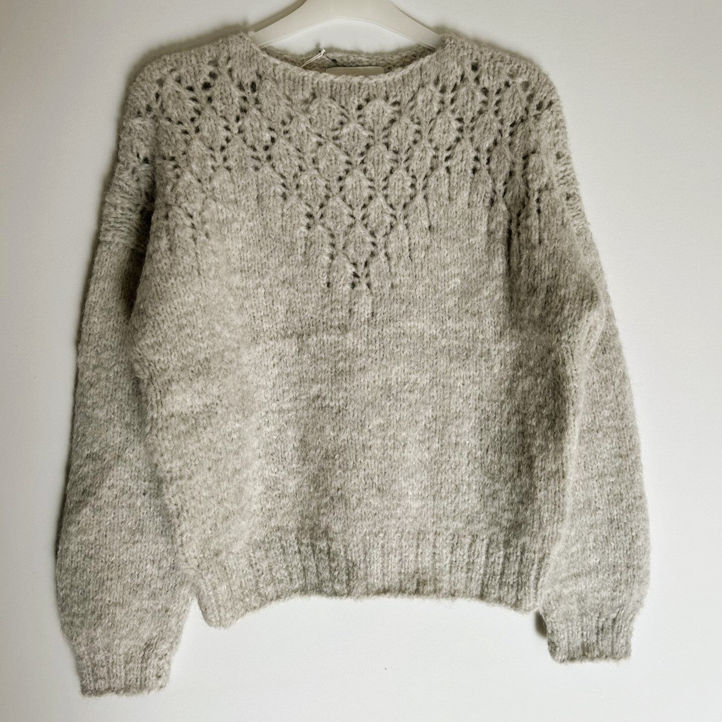 Deze prachtige zilverkleurige trui van INTI Knitwear heeft een rechte boord en is ruimvallend. Op de hals, rug en schouder is een patroontje ingebreid. Maat M heeft een lengte van 54cm (middenachter). Deze trui heeft extra lange mouwen!