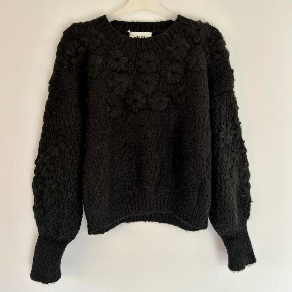 Deze prachtige dikke trui van INTI Knitwear heeft een ronde hals en elegante geborduurde bloemen. De kleur is natuurlijk diepzwart, dus ongeverfd. De mouw poft een beetje. Maat S-M heeft een lengte van 58cm (middenachter, incl. boord).