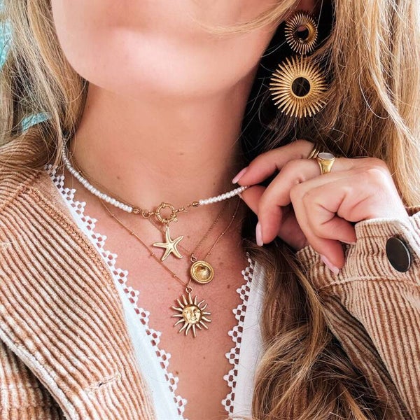 De sieraden worden gemaakt van zorgvuldig gekozen materialen en voorzien van bijzondere details. Deze parelketting staat prachtig bij jouw zomerse kleurtje en is perfect voor layering! Het zeester bedeltje kan verwijderd worden.