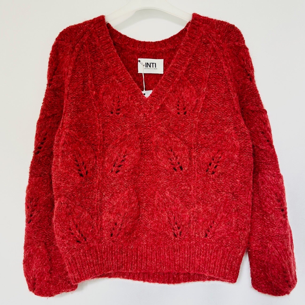 Deze trui van INTI Knitwear heeft een V-hals en een prachtig patroon van bladeren. In een mooie gemeleerde roodtint. De ruglengte bij maat S-M is 55cm.