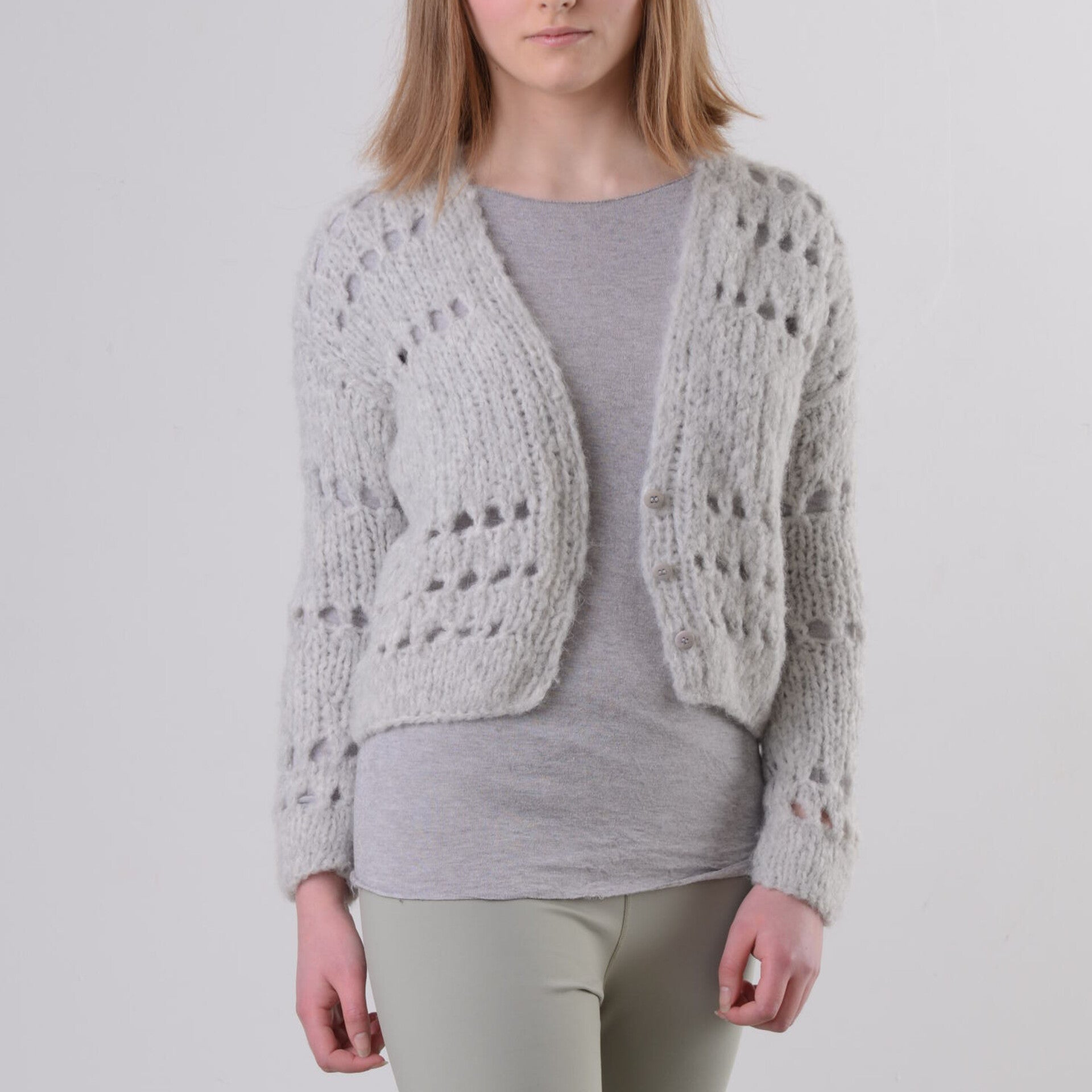 Dit korte vest met diepe V-hals van INTI Knitwear heeft een opengewerkt horizontaal patroon. De kleur Silver van INTI is makkelijk te combineren en raakt nooit uit de mode! Past perfect op een zomers jurkje.
