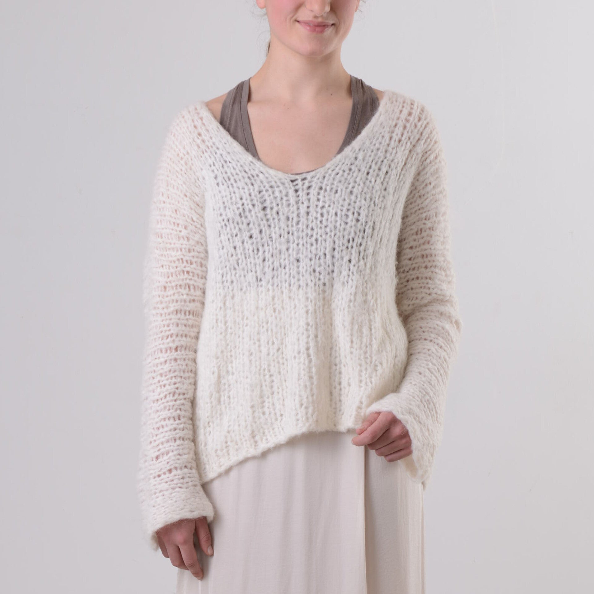 Deze losgebreide trui met V-hals van INTI Knitwear is de ideale trui all-year-round. De kleur Ecru van INTI is 'clean' en is niet mode gevoelig. Makkelijk te combineren met vrijwel alles!