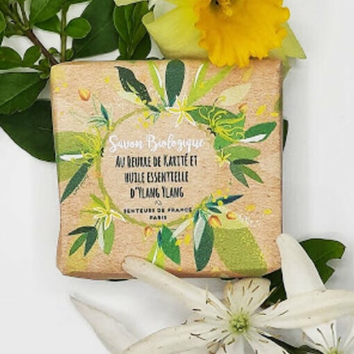 Deze zeep wordt gemaakt op basis van biologische ingrediënten en is geparfumeerd met essentiële Ylang Ylang olie. Ylang Ylang is een tropische bloem en staat bekend om zijn kalmerende en stresswerende kracht. De geur is vol, zoet en bloemig. Er is karité (shea butter) toegevoegd om de huid niet te laten uitdrogen. Blok van 100gram.