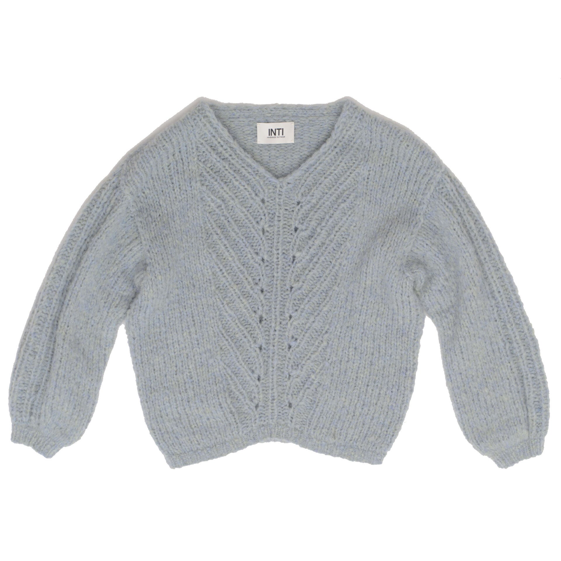 Prachtige nonachalante grofgebreide trui van INTI Knitwear in gemeleerd grijsblauw met V-hals en kleine ballonmouw. Bloust een beetje door de ingebreide band en manchetten. Ingeweven patronen op de voorkant en de mouwen.