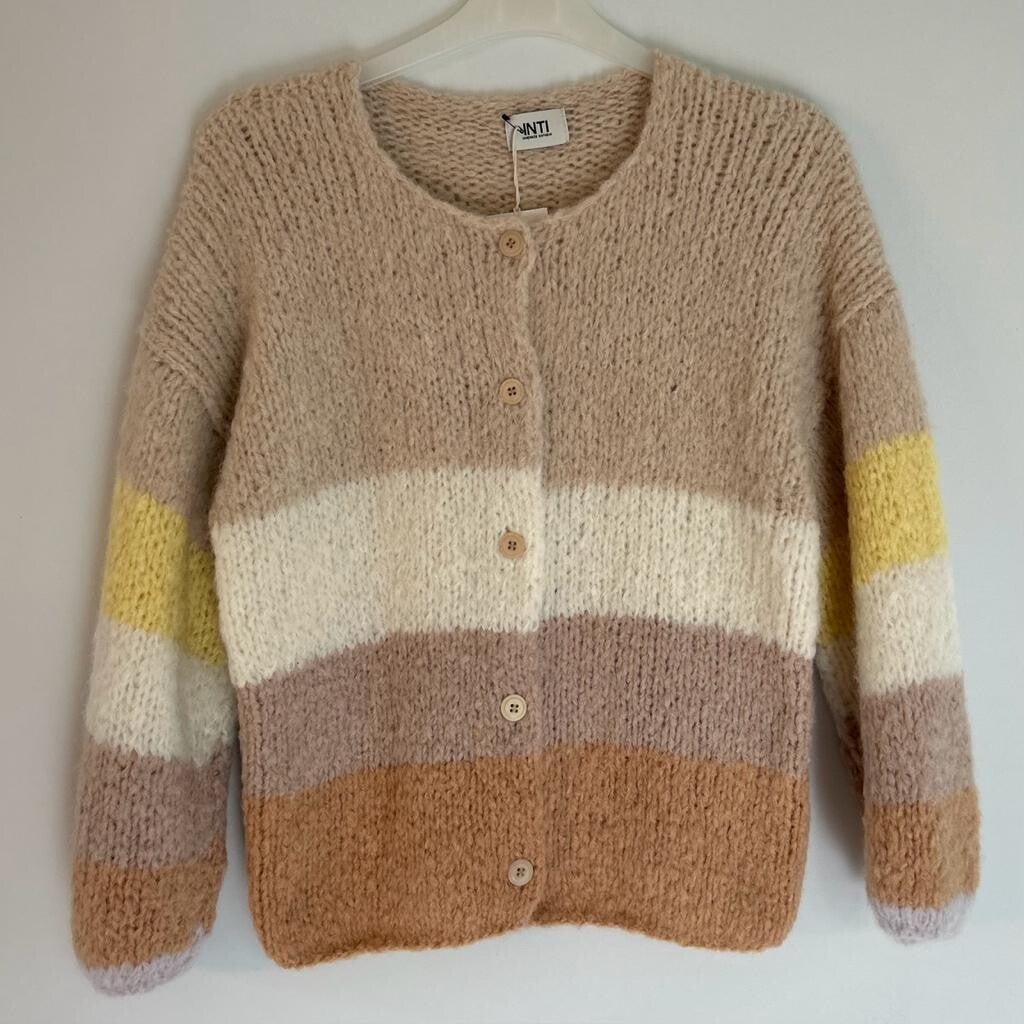 Dit vest van INTI Knitwear heeft balon mouwen en een ronde hals. Het vest sluit met knopen aan de voorzijde en is een heerlijk vest all-year-round over een shirt of jurk. De kleur bestaat uit zachte pastelkleuren.