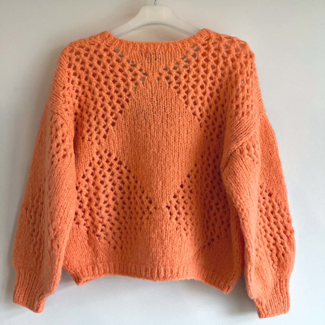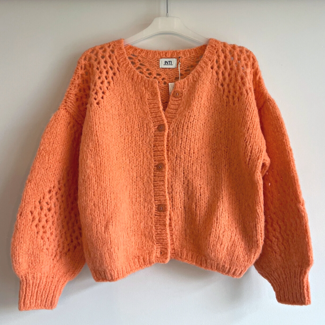 Dit vest van INTI Knitwear heeft pofmouwen, een ronde hals en een opengewerkt patroon. Het vest sluit met knopen aan de voorzijde en is een heerlijk vest all-year-round over een shirt of jurk. De koraalkleurige wol straalt een vrolijke warmte uit.