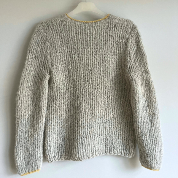 Deze trui van INTI Knitwear heeft een V-hals met een gekleurde bies. De trui is gemaakt in een prachtige gemeleerd grijs- en geel combinatie.